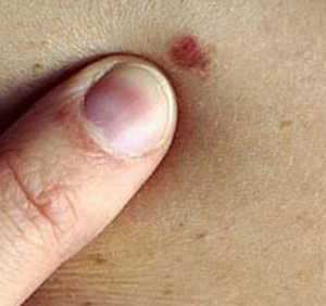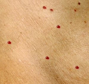 Petechiae are small, pinpoint red or purple spots caused by bleeding under the skin. Unlike cherry angiomas, they do not blanch (turn white) when pressed. Petechiae can result from minor injuries, but in some cases, they may indicate more serious conditions such as infections or blood disorders.